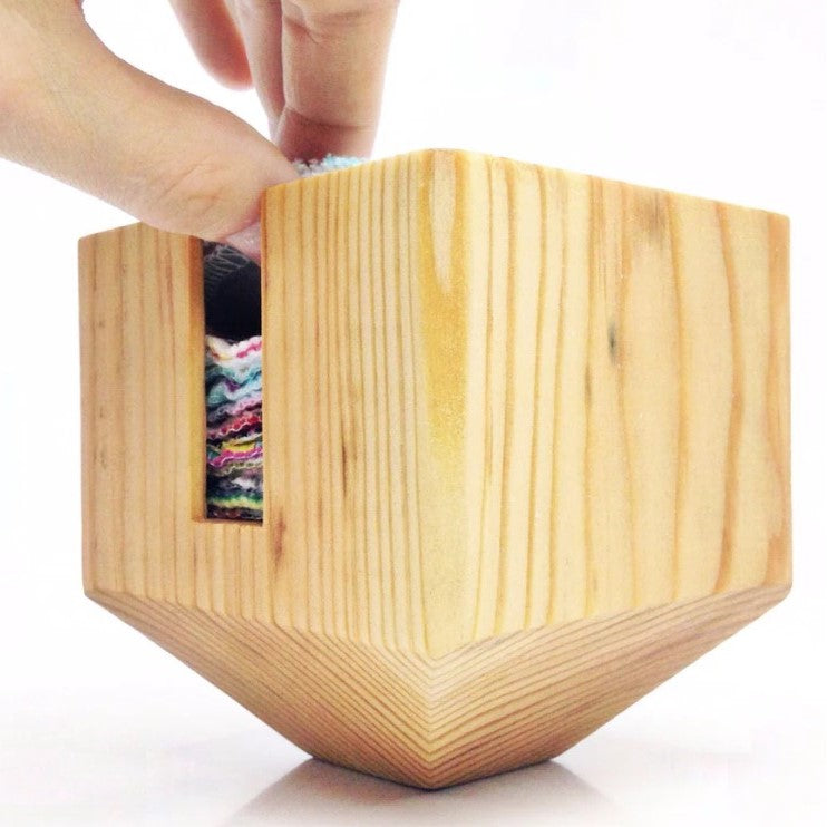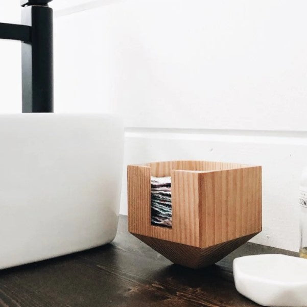 These facial round holders are carved out of solid 3.5" x 3.5" blocks of Douglas Fir and finished with natural tung oil. Each face round holder can hold at least 20 facial rounds.